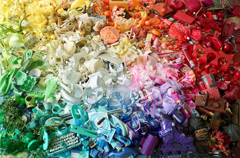 On a relatively minor scale Jane likes to create order and patterns out of random found objects, old toys, plastic bits and bobs, “mini-kipple”, you could say – as in this photograph (published by Uppercase magazine).