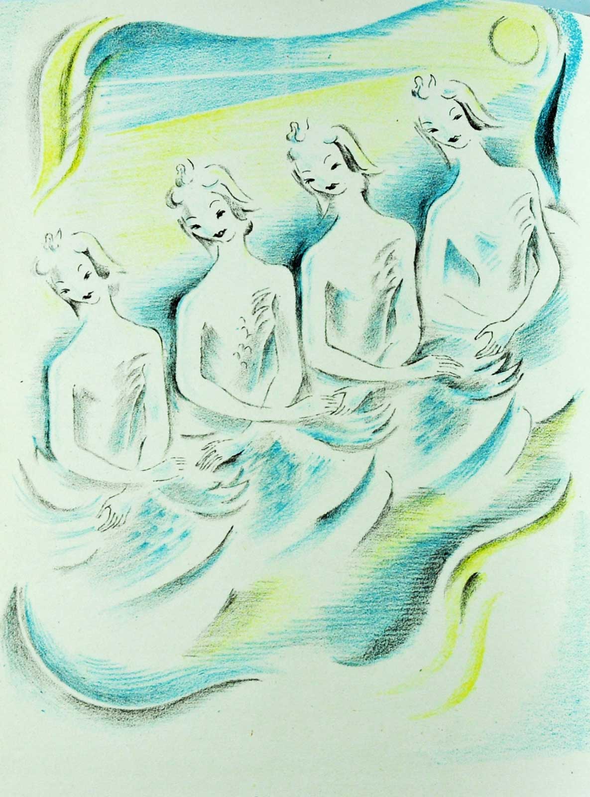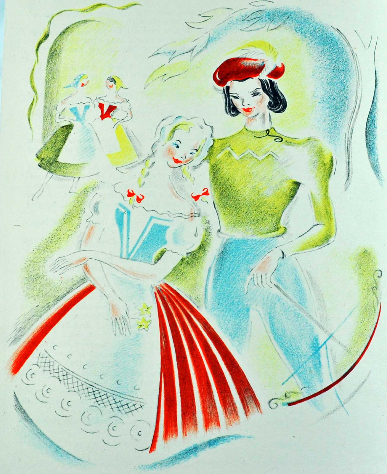 The lithographs are credited to Sylvia Green who was actually a theatrical costume designer: some of the sketches from her work are held by the V&A and are very similar to the graceful, finely drawn pictures in the book.