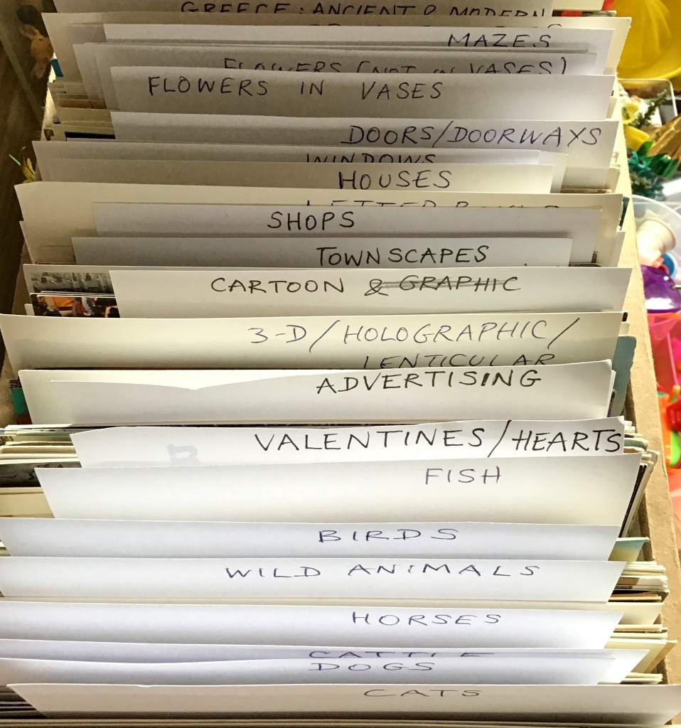 Since then, my postcard collecting has continued, branching out in various directions. That original set of modern cards has grown, added to with cards from art shows and holidays — I’ve sorted them into groups by subject, as you can see above.