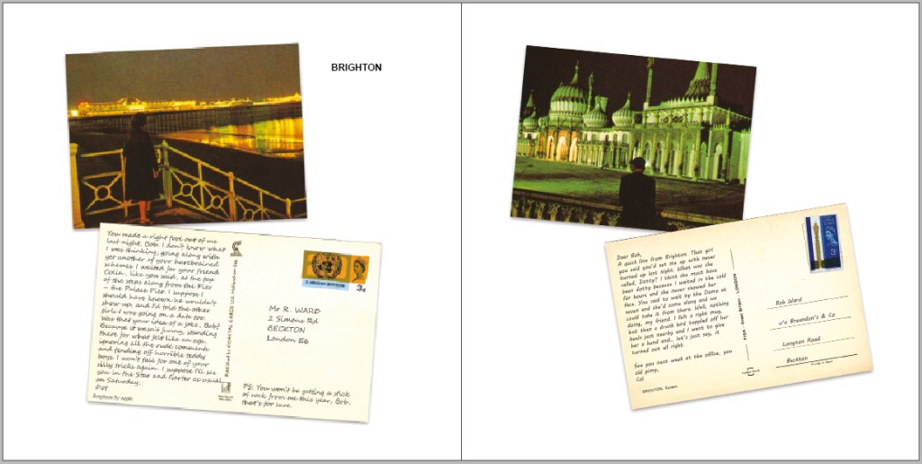 Above is a page taken more or less at random out of my big album of postcards which have the potential to inspire stories. I love these so much, and it’s these I’ve used in the book you can see at the top of this post: Blow-Ups: Stories from old postcards. The two postcards of ‘Brighton by night’ made me imagine a scenario where the man and woman in the two different shots have missed each other on a blind date that their friend has set them up on. Here’s the page in the book: