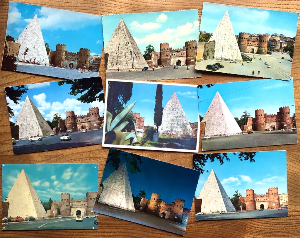 What I really need to do, though, is to stop buying more old postcards and thoroughly sort out the ones I’ve already got — thousands by now, I suspect. But how to order them? By place? By subject matter? By colour? By their potential for various art projects? The permutations are endless. But I will leave you with the happiness that is my (growing) collection of postcards of the Piramide in Rome…