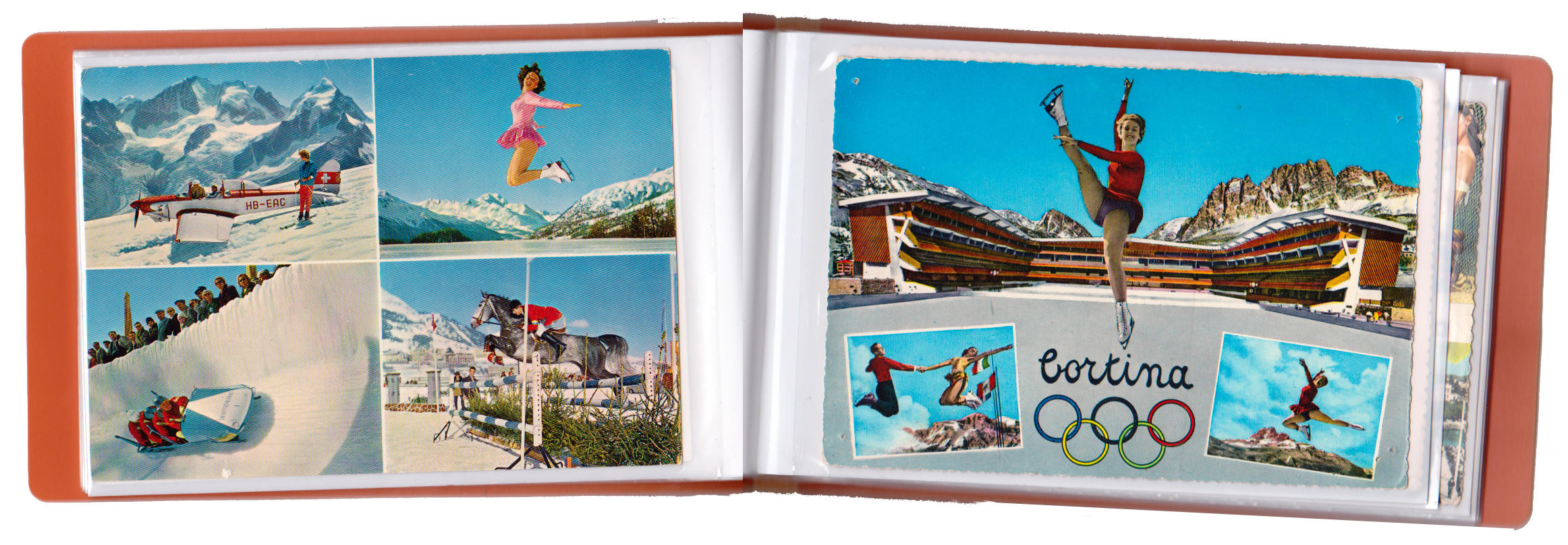 Above is a page from the album where I keep cards that I’ve used in paintings. If you follow me on Instagram (@foundandchosen), you’ll perhaps recognise the iceskater in a pink dress — I use my painting of her as my avatar. I’ve done paintings of four of the other images you can see here as well (spot them here).
